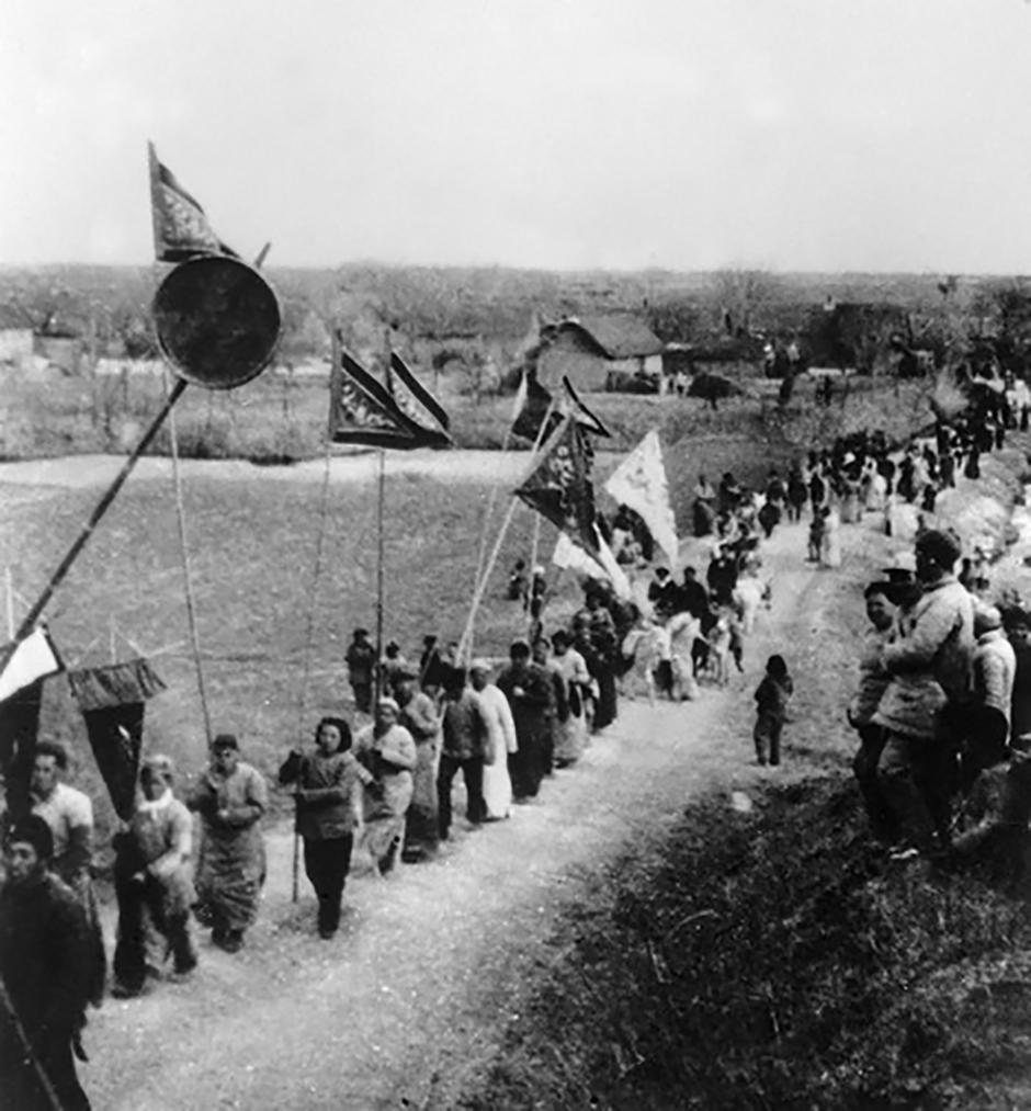1943年冬,在蘇北抗日根據地,群眾紛紛將自己的子弟送到新四軍中(資料照片)。新華社發