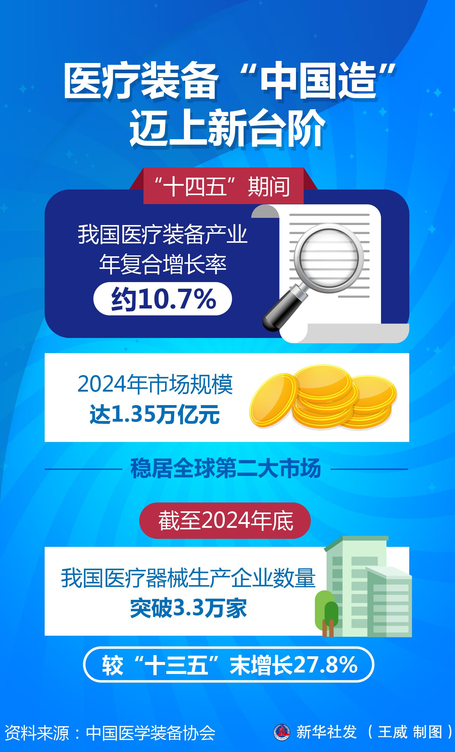 “‘十四五’期間,我國醫療裝備產業年復合增長率約10.7%,2024年市場規模達1.35萬億元,穩居全球第二大市場。”中國醫學裝備協會理事長侯巖介紹,截至2024年底,我國醫療器械生產企業數量突破3.3萬家,較“十三五”末增長27.8%。