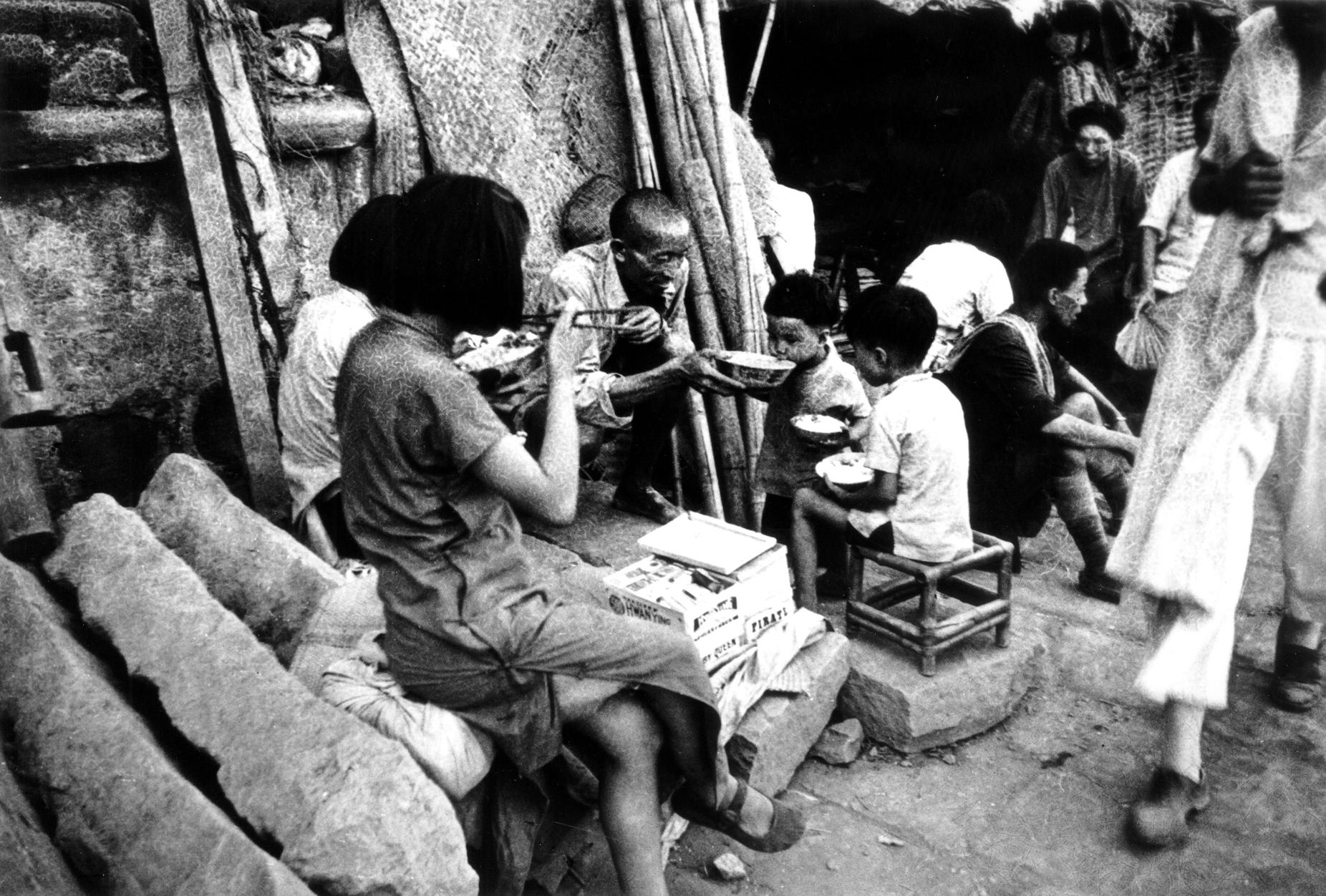 一戶人家在敵機離去后,坐在家門口吃飯。資料圖