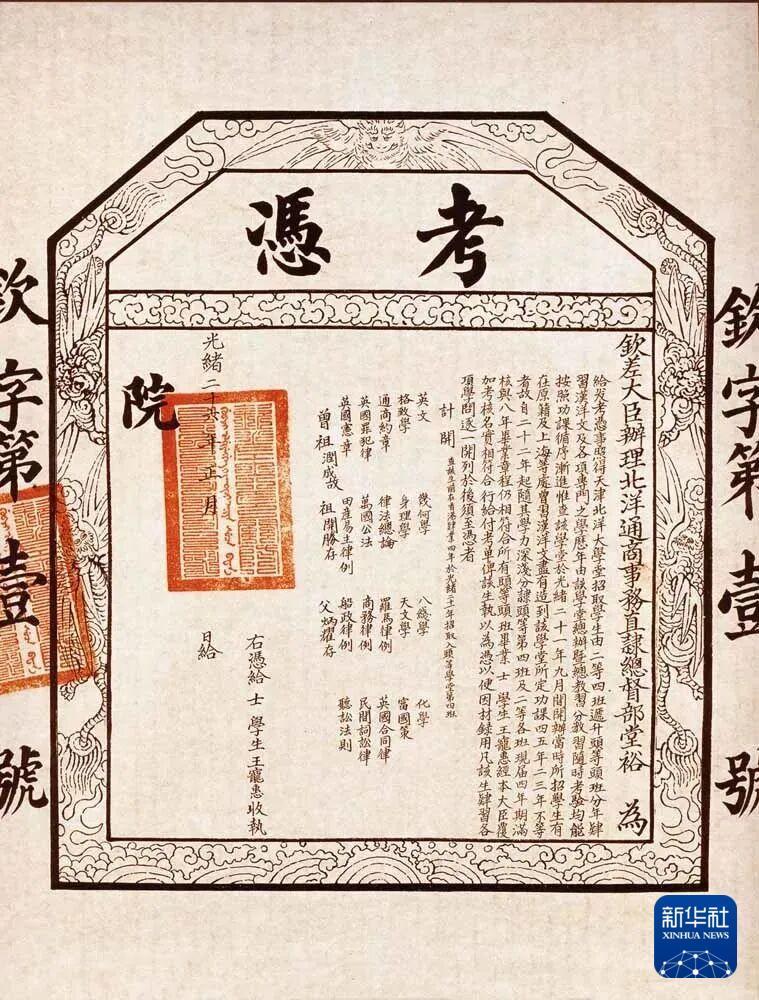 這是北洋大學堂授予法科生王寵惠的考憑。