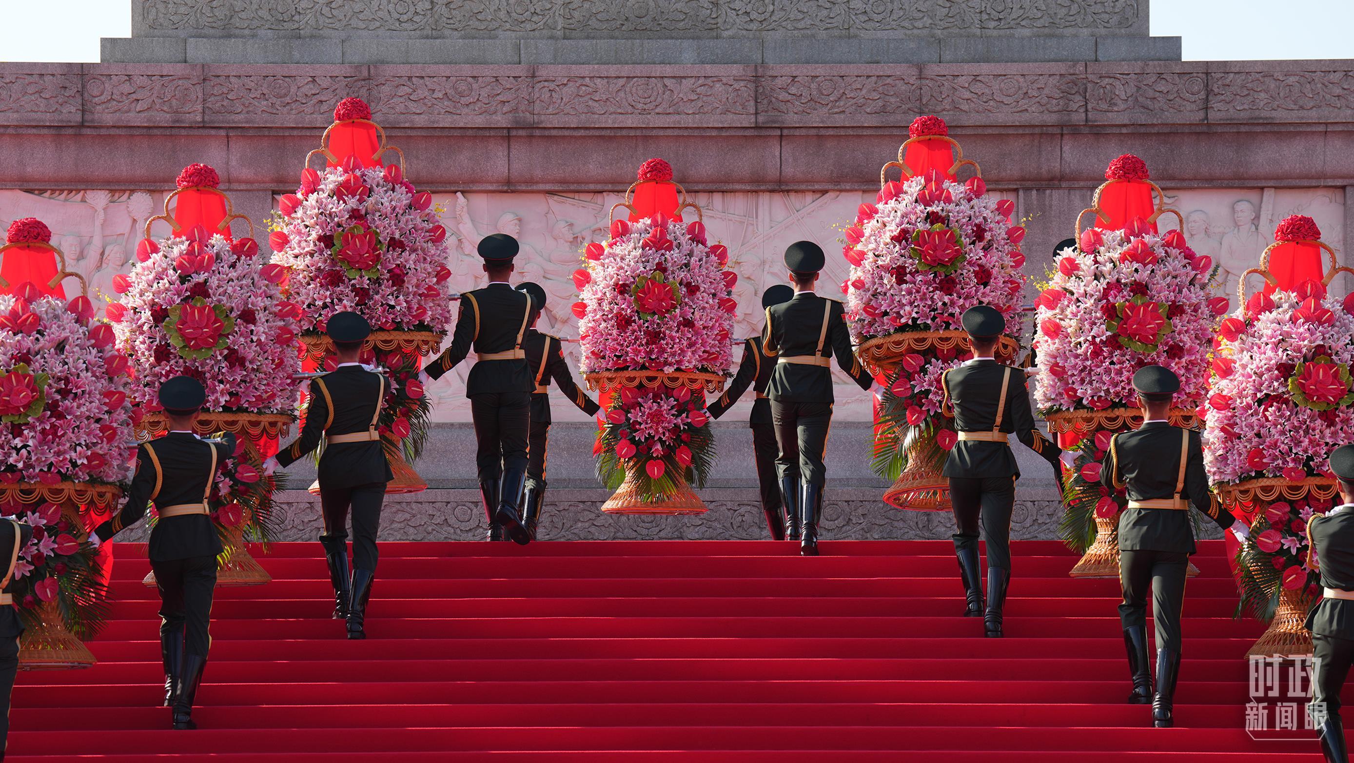 18名禮兵穩穩抬起花籃,緩步走向人民英雄紀念碑,將花籃擺放在紀念碑基座上。