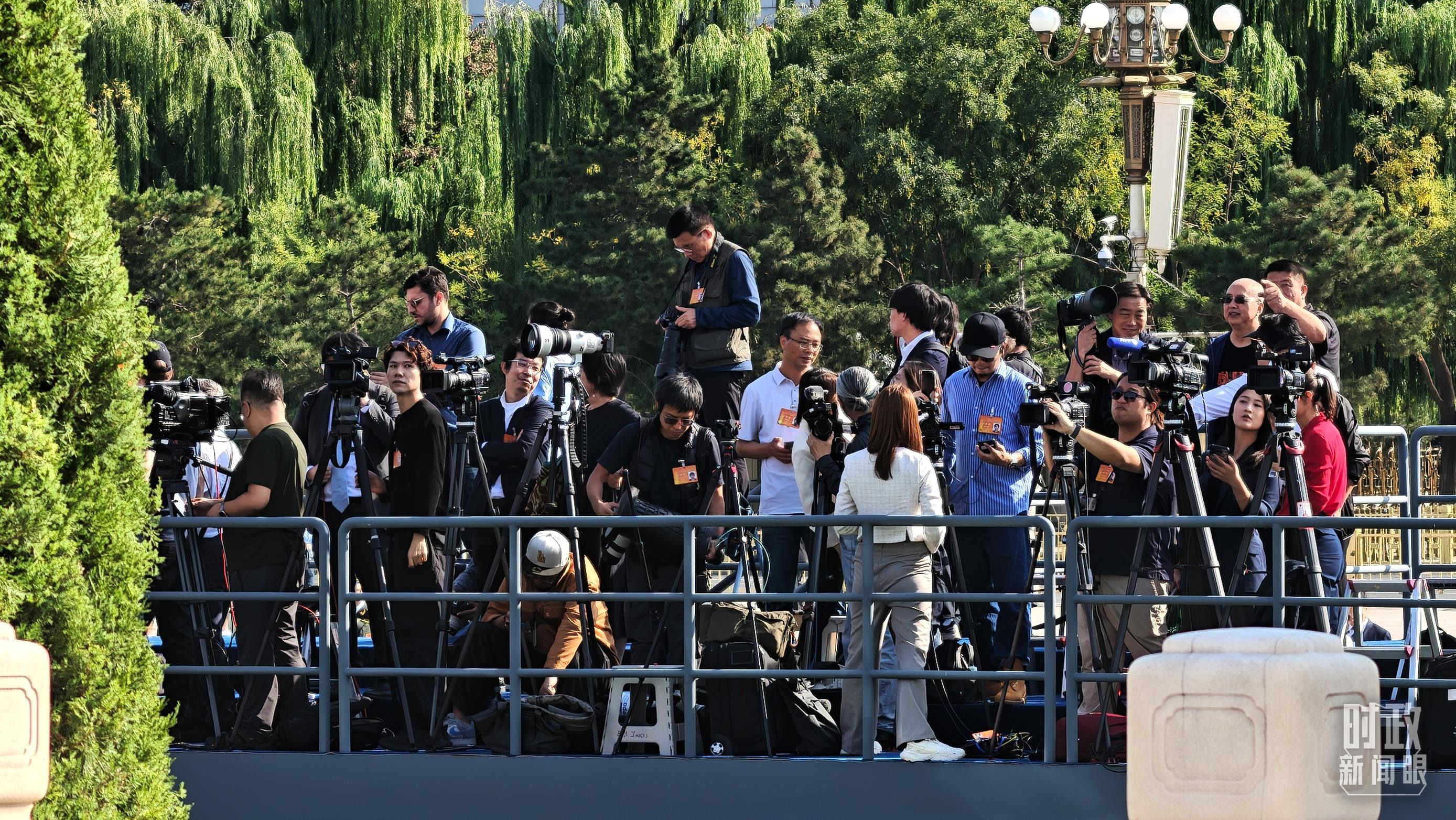 △9月30日,天安門廣場上現場報道的記者。(總臺央視記者鄂介甫拍攝)