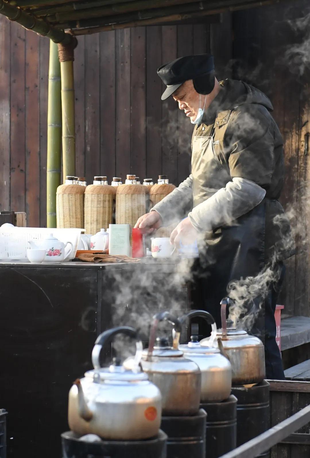一名攤主在烏鎮一邊煮茶一邊給客人制作早餐。新華社記者 翁忻旸 攝