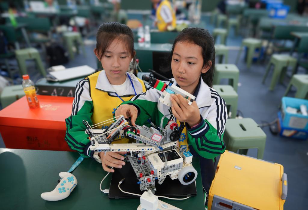 5月31日,兩名參賽選手在全國青少年科技教育成果展示大賽云南省區域賽上調試比賽用的機器人。新華社記者 陳欣波 攝
