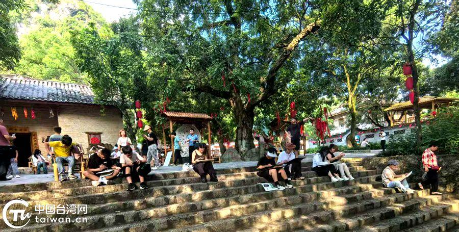 中國臺(tái)灣網(wǎng)8月25日訊 在廣西河池市都安瑤族自治縣東廟鄉(xiāng)天窗群的喀斯特峰叢小徑中,顏料與驕陽交相輝映,20余名兩岸書畫藝術(shù)家、青少年以筆墨為舟,將色彩在宣紙上暈染開來……