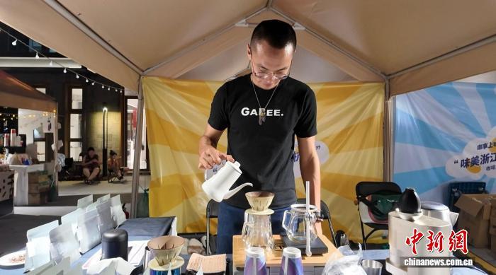 國慶假期,臺灣咖啡師李毅在浙江杭州的咖啡文化嘉年華上手沖咖啡。錢晨菲 攝