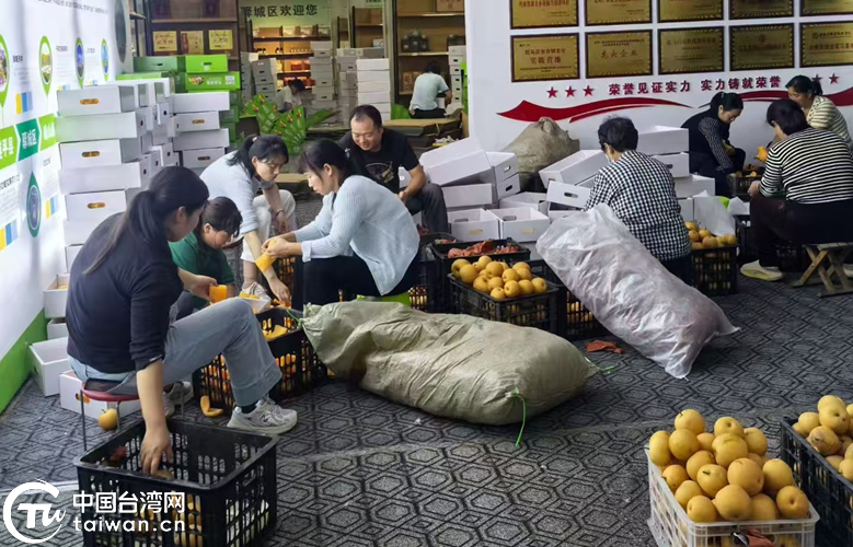 臺胞志愿者們與農人們共同分裝滯銷的秋月梨。(中國臺灣網發)