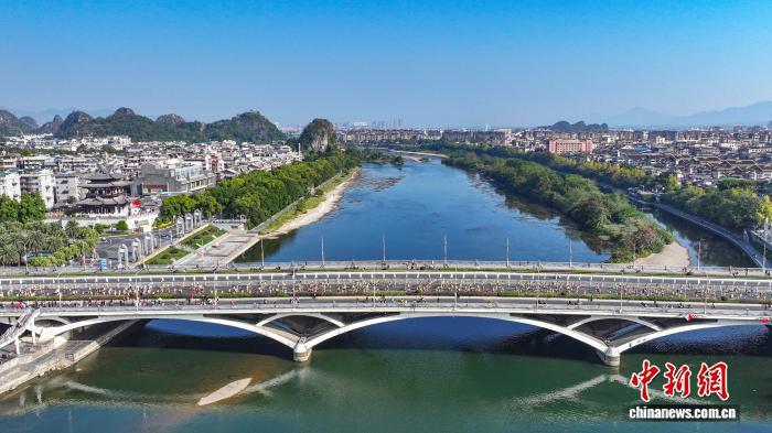 圖為11月16日,2025桂林馬拉松參賽選手通過解放橋。(無人機照片)楊宗盛 攝